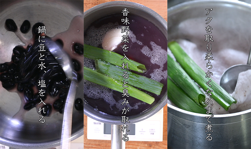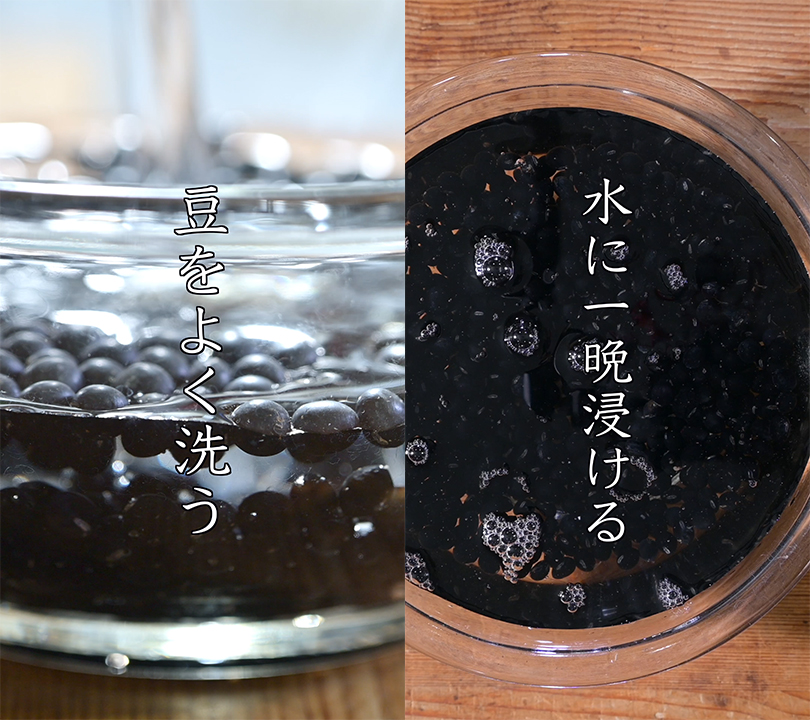 1. 黒豆をよく洗い、水に一晩浸ける。