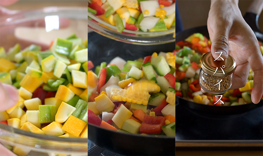 1. 野菜をカットし、油で炒める。 スパイスを加えて混ぜる。